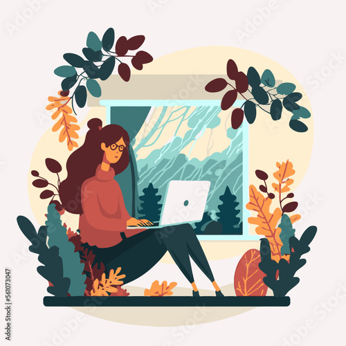 Šťastný romantický pár sledoval východ slunce sedí na padlé log v lese, ploché vektorové ilustrace. Turisté s batohy turistika, kempování, trekking. Letní outdoorové aktivity, turistika, cestování.
