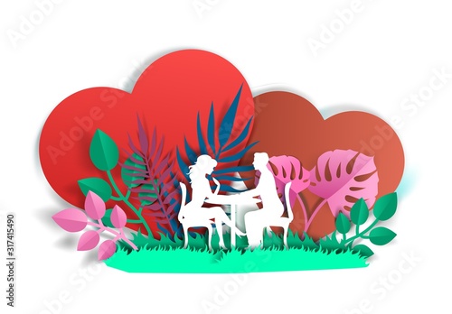 Milující pár sedí u stolu a mluví k sobě, květinové pozadí se dvěma obrovskými srdci, vektorové ilustrace v papírovém uměleckém řemeslném stylu. Romantická večeře kompozice pro plakát, banner atd.