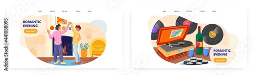 Romantický večer vstupní stránky design, webové stránky banner šablony set, plochý vektorové ilustrace. Šťastný pár pití vína, jíst sushi, tanec na hudbu u krbu. Romantické rande doma.