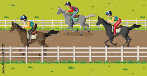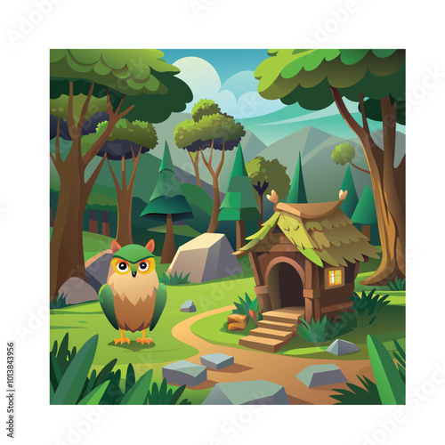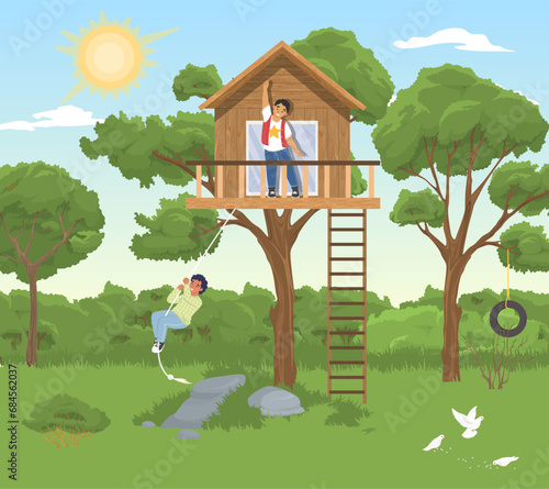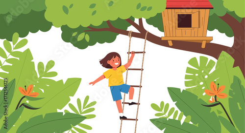 Lano adventure park ploché vektorové ilustrace. Šťastní dospělí lidé a děti šplhají po stromech, překonávají překážky, užívají si extrémní rekreační čas venku