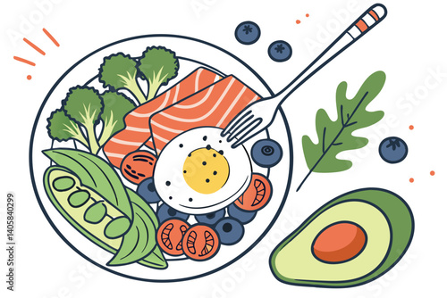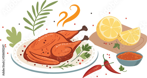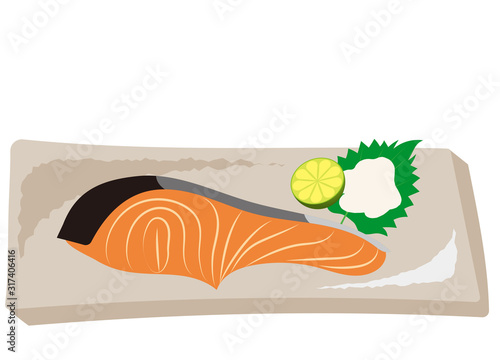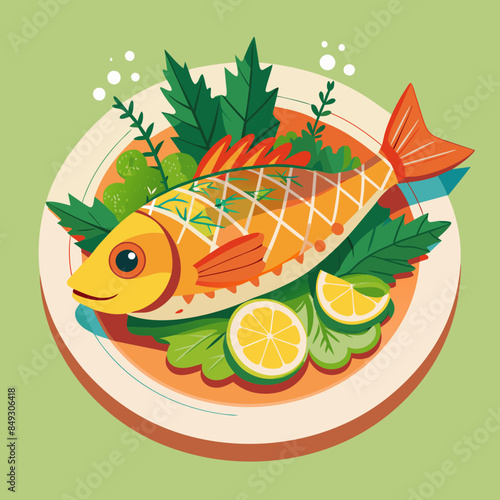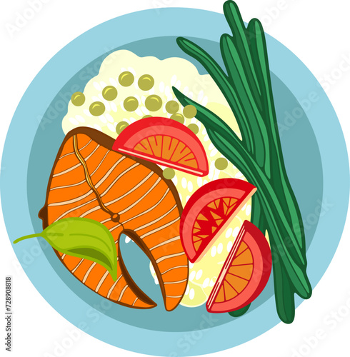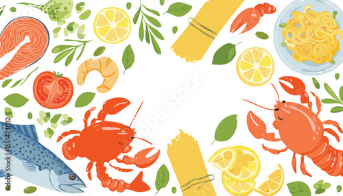 Lososově červený rybí steak na dřevěném prkénku s plátky citronu, pepře a rajčat a pikantní bylinkou, vektorové realistické zobrazení shora ilustrace. Čerstvé mořské plody vaření složení pro menu, recept, web banner.