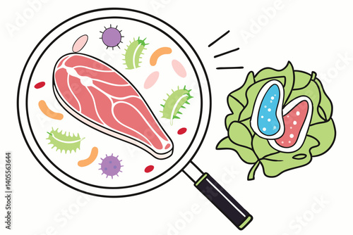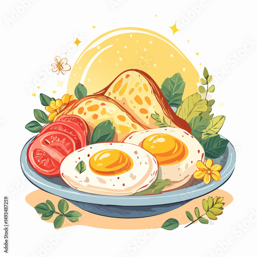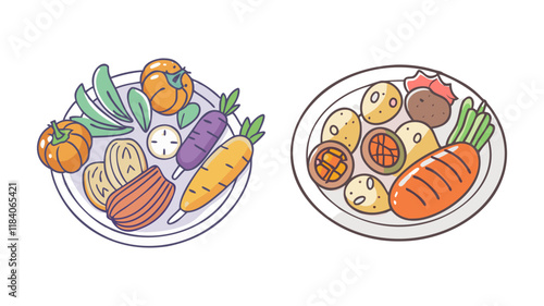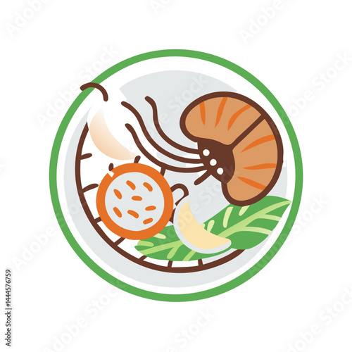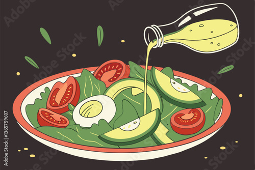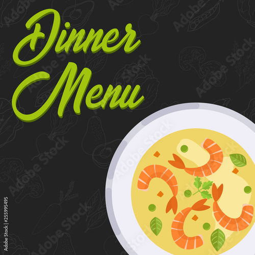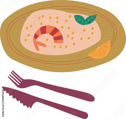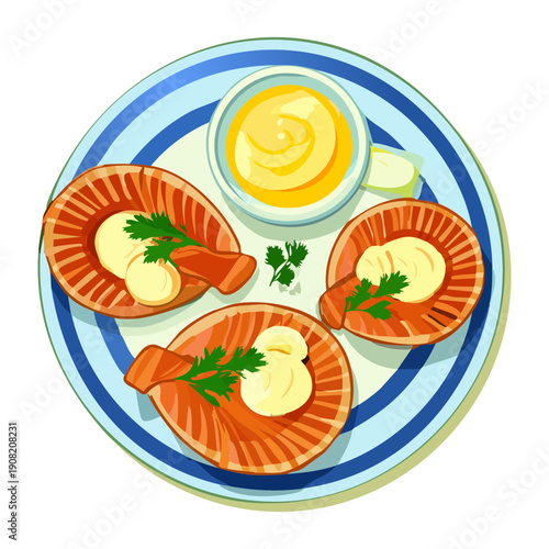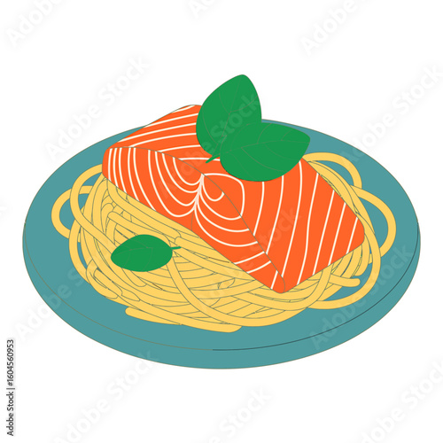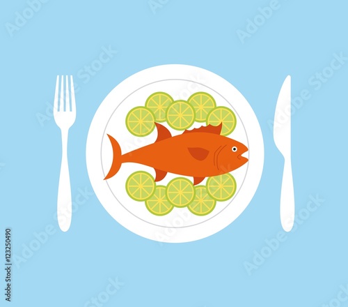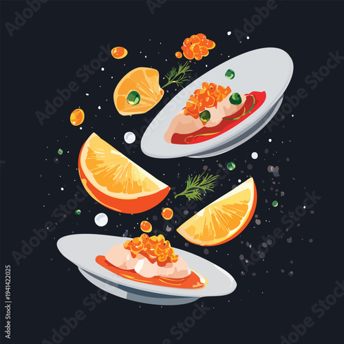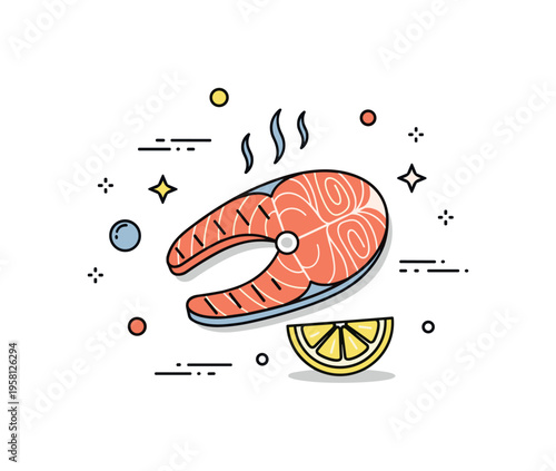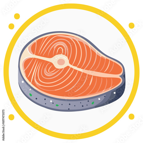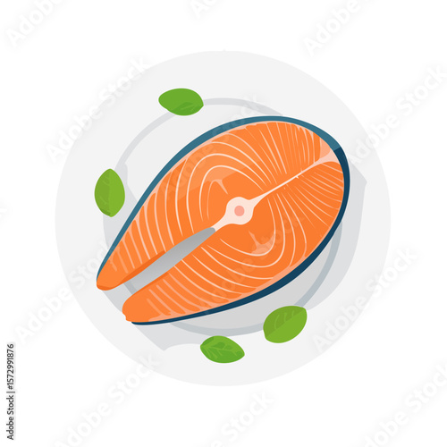 Lososově červený rybí steak s citronem, pepřem, plátky rajčat a pikantní bylinkou na talíři, vektorové realistické zobrazení shora ilustrace. Smažené nebo grilované mořské plody složení pro menu, recept, web banner.