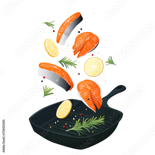 Lososově červené ryby padající steaky, filé s plátky citronu a pikantní bylinou, vektorové realistické ilustrace. Zdravé organické mořské plody vaření složení pro menu restaurace, recept, atd.