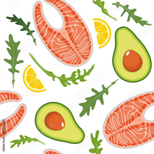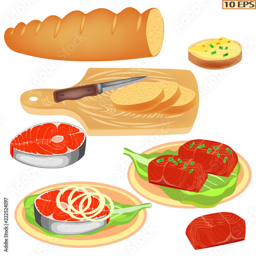 Lososově červené ryby syrové steaky, filé s plátky citronu a pikantní bylinkou, vektorové realistické ilustrace. Čerstvé organické složení mořských plodů pro restauraci, sushi barové menu atd.