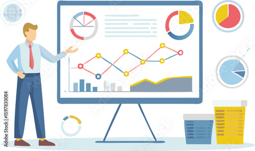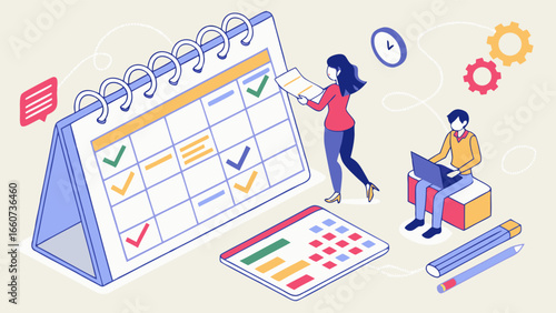 Ušetřete čas vektor. Koncept produktivity. Muž na volné noze pracovní notebook sedí na obchodním dokumentu poblíž přesýpacích hodin izometrický 3D design