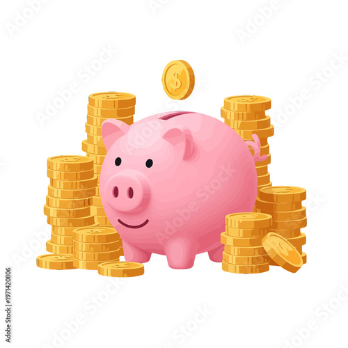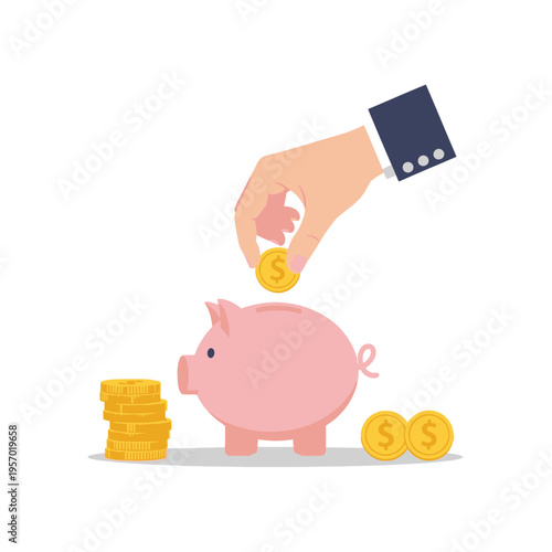 Úspora peněz koncept vektorové ilustrace. Pink prasátko se zlatými mince piloty na pozadí. Lidská ruka dát peníze do prasátko.