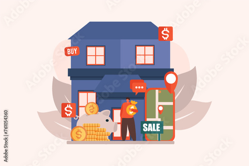 Úspory s konceptem inteligentního domu vektorové ploché ilustrace. Dům s automatizovaným zabezpečením domácnosti, osvětlením a dalšími systémy ovládanými na dálku, dolarové mince vypadávající z budovy do peněženky.