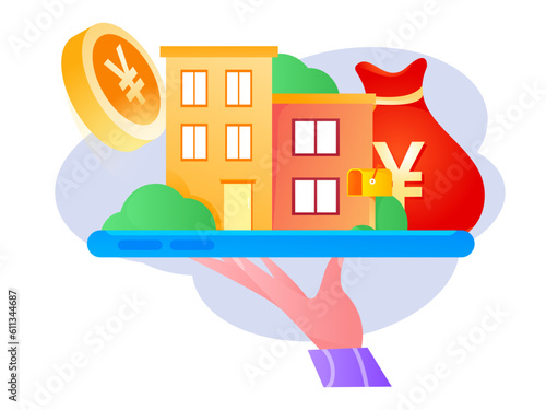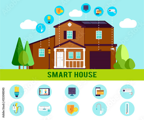 Úspory s konceptem inteligentního domu vektorové ploché ilustrace. Dům s automatizovaným zabezpečením domů, osvětlením a dalšími systémy ovládanými na dálku, dolarové mince vypadávající z budovy do lidské ruky.