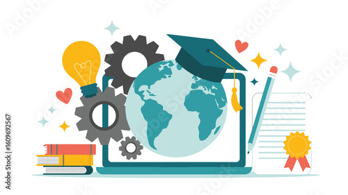 Školní a vzdělávací vektorové ilustrace sada izolovaných na bílém pozadí. Školní budova, autobus, žáci, batoh, promoce klobouk, psací potřeby a další školní potřeby.