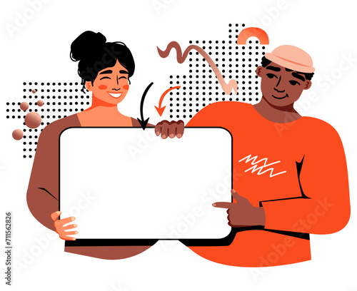 Školní chlapec a dívka drží prázdný plakát z bílého papíru. Vektorová ilustrace v komiksovém pop artovém stylu. Vložte svůj vlastní text.