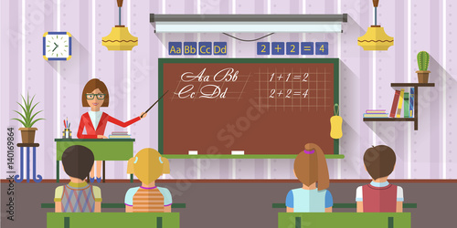 Vektorová ilustrace učitele, který sedí u stolu a ukazuje na tabuli, školní děti sedí u stolů. Interiér učebny. Školní koncept designový prvek v plochém stylu.