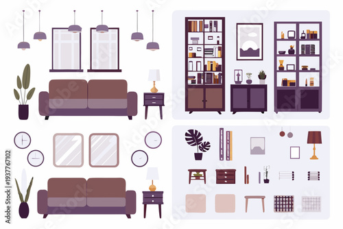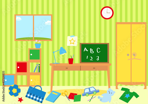 Vektorová ilustrace učitele, školní děti, otec s dcerou, interiér školní chodby se skříňkami. Školní koncept plochý styl designové prvky.