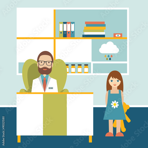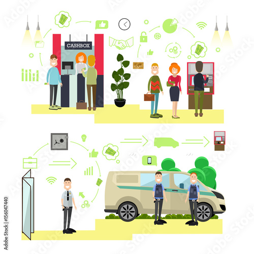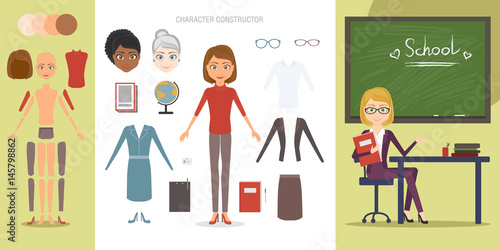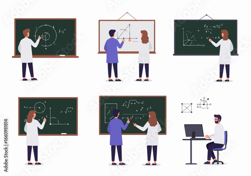 Vektorová ilustrace učitelky s ukazatelem stojícím vedle tabule, studenti, ředitel školy v jeho kanceláři. Symboly školních lidí, ikony izolované na bílém pozadí. Plochý design.