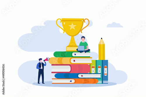 Škola. Učitelka s ukazatelem stojícím na hromadě knih, plochá vektorová ilustrace. Zpět do školy, Vysoká škola nebo univerzita scéna s malými postavami a obří papírnictví.