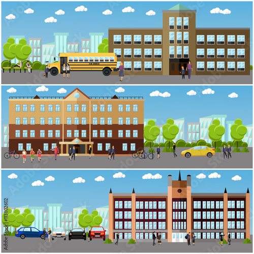 Vektorová sada plakátů s interiérem učebny a chodby s nábytkem, skříňkami a školními potřebami, sportovištěm s fotbalovými cíli. Školní koncept plochý styl designové prvky.