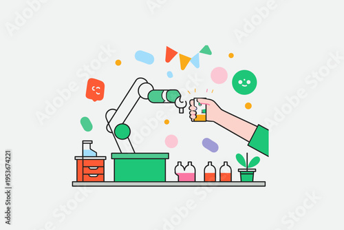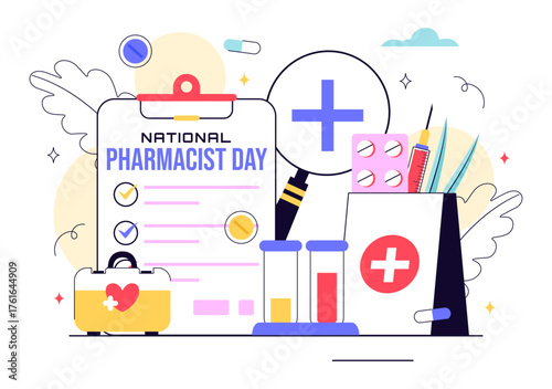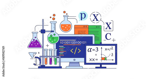 Vektorový plochý designový plakát s prvky designu chemie, fyziky, biologie, biologie, ikon. Laboratorní sklo a vědecké vybavení.
