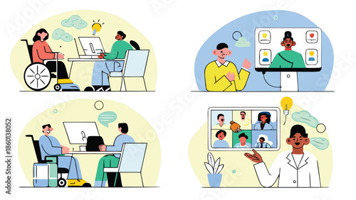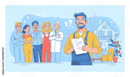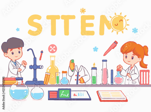 Věda pro děti. Kreslený vědec ukazuje dětem chemický experiment v laboratoři. Vektorové Ilustrace.