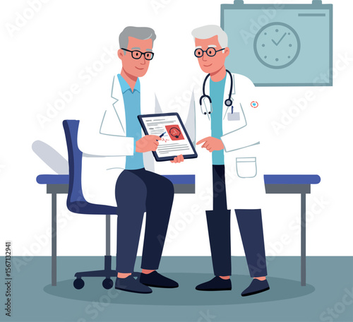 Vektorová ilustrace vědců mužů demonstrujících výsledky testů. Věda lidé koncept plochý styl designový prvek, ikona izolované na bílém pozadí.