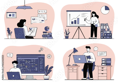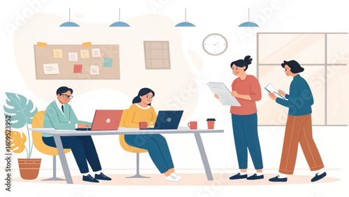Vědeckovýzkumná laboratoř. Vědci, mužské a ženské postavy studující genetiku, diskutující o vědeckých objevech, ilustrace plochého vektoru. Biotechnologie, genetické inženýrství, medicína a technologie