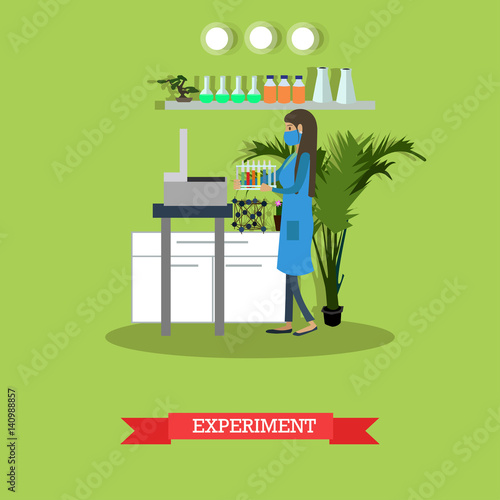 Vektorová ilustrace bioložky nebo chemičky v ochranné masce a laboratorním plášti provádějící experiment. Laboratorní vybavení a interiér. Vědecký experiment designový prvek v plochém stylu.