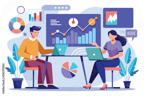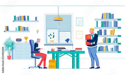Vědeckovýzkumná laboratorní scéna. Vědec mužská postava studující molekulu dna mikroskopem sedící u stolu s laboratorními baňkami, plochá vektorová ilustrace. Věda a vzdělávání.