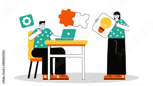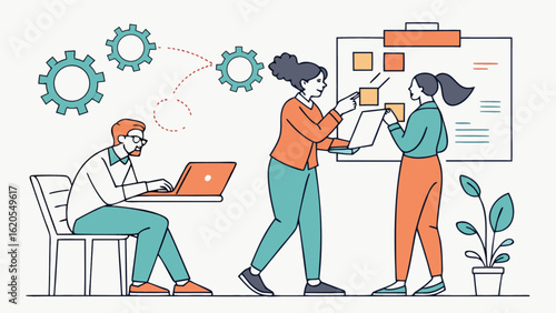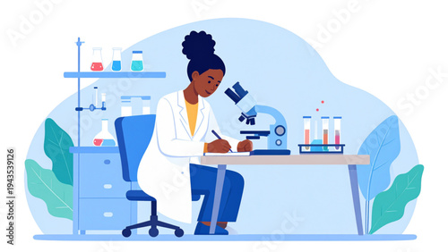 Vědeckovýzkumná laboratorní scéna. Vědci mužské a ženské postavy v laboratorních pláštích dělat výzkum pomocí laboratorního vybavení, dávat prezentaci, ploché vektorové ilustrace. Věda a vzdělávání.