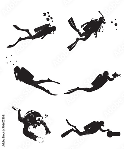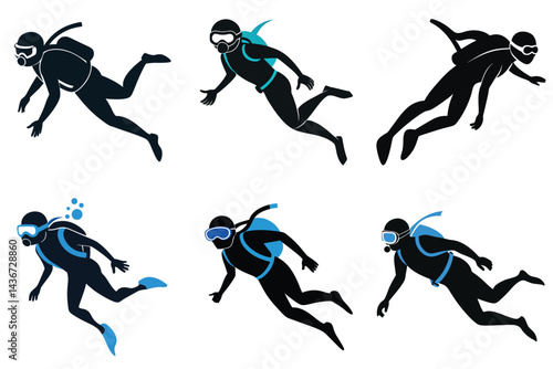 Mužské a ženské potápěčské postavy v neoprenu, aqualung a brýle plavání a plovoucí izolovaná sada. Turista nebo sportovci se těší extrémní podvodní aktivity vektorové ilustrace