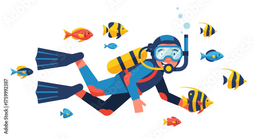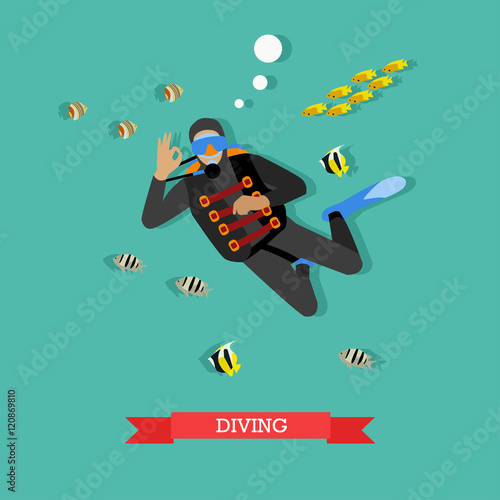 Potápěč pod vodou s tropickými rybami. Potápěčské vybavení a vybavení, potápění, maska, ploutve a neopren. Podvodní aktivní odpočinek. Vektorové ilustrace v plochém designu