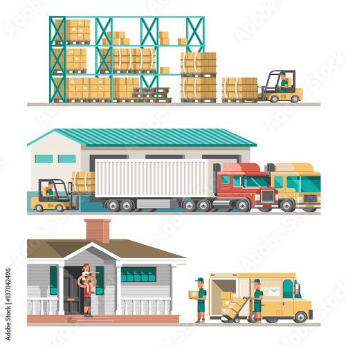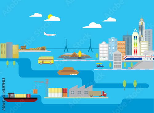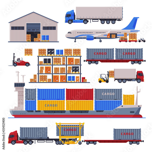 Sea cargo service vector. Ilustrace námořního přístavu. Globální koncepce mezinárodní nákladní logistiky a dodávek. Velká loď import export kontejner box přes oceán nad světem