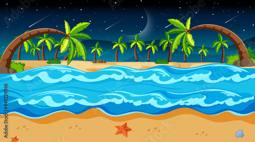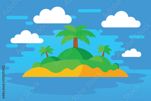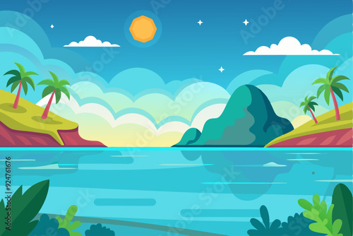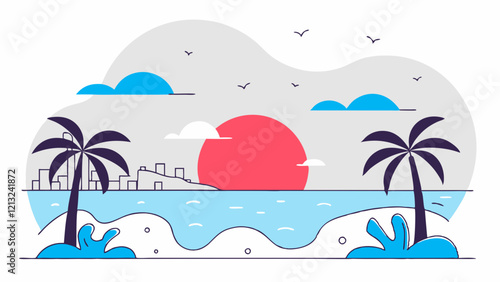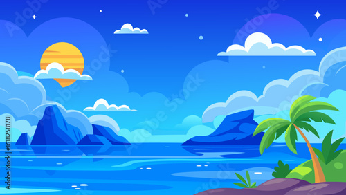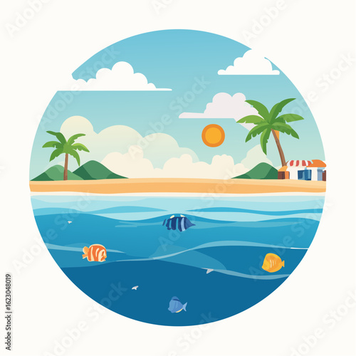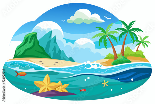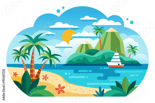 Sea cruise liner v oceánu nad tropickým ostrovem s palmami a delfíny plavání pozadí. Osobní loď luxusní plachetnice plovoucí na vodní hladině v létě papercut vektorové ilustrace