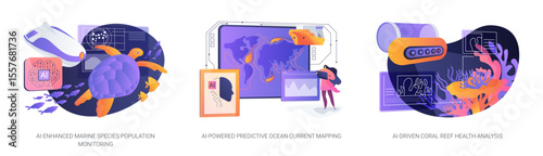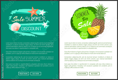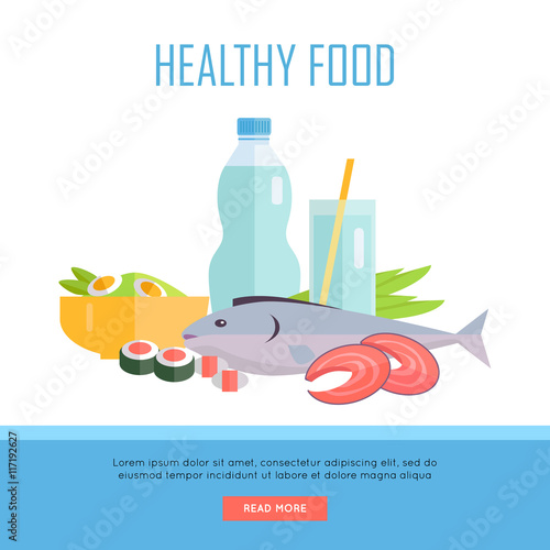 Seafood production website banner template set, vektorové ilustrace. Steak z tuňáka ve vakuovém plastovém obalu, konzervovaný sleď, sardinky. Koncept vstupní stránky mořského průmyslu.