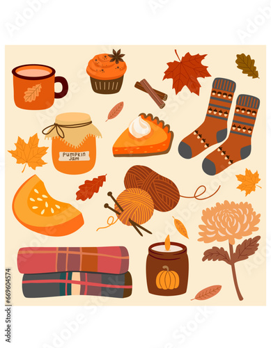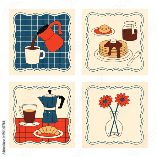 Bezešvé vzor s kávou a čajovými předměty. Vektorové ilustrace pozadí. Francouzský tisk káva, čaj hrnec, šálky, dort a croissant.