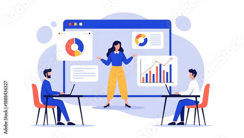 Ateliér, oděvní továrna, oděvní dílna, vektorový plochý design ilustrace. Drobné postavy žena švadlena šití na velkém elektrickém šicím stroji, muži drží tlačítko, náprstek. Přizpůsobení.