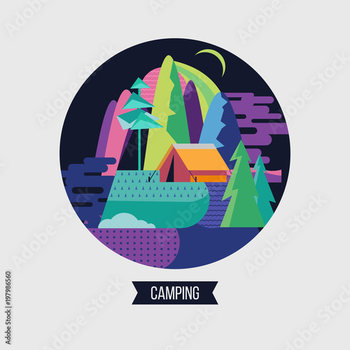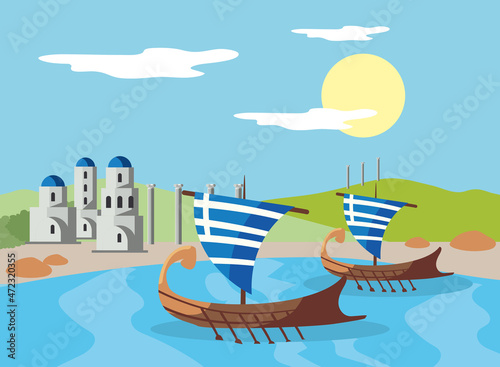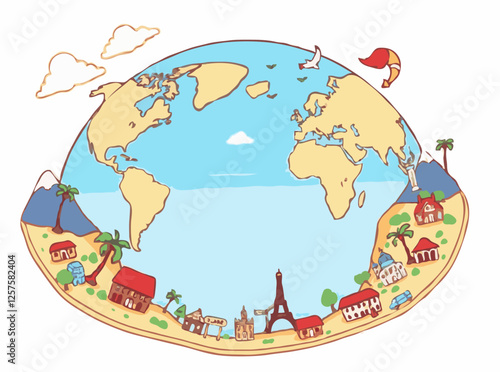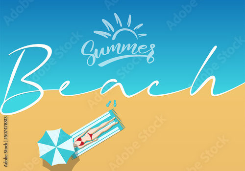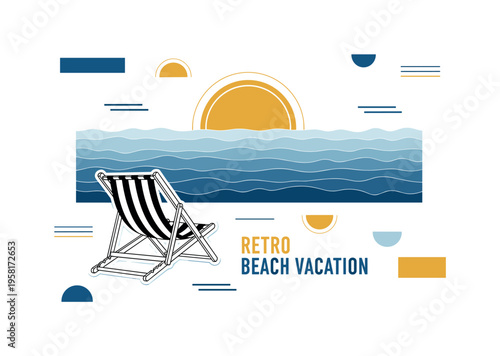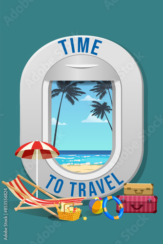 Zvětšovací sklo s ocean beach, lehátko žabky sluneční brýle, palmové listy, loď plovoucí na vodě uvnitř, vektorové papírové umělecké ilustrace. Hledat nejlepší tour koncept pro web banner atd.