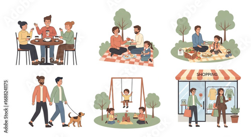 Starší pár chodí s holemi v autumn parku. Stará žena sedět v křesle a číst knihu. Prarodiče mluví se svými dětmi o videohovoru. Důchodový život koncepce vektorové plakáty set.