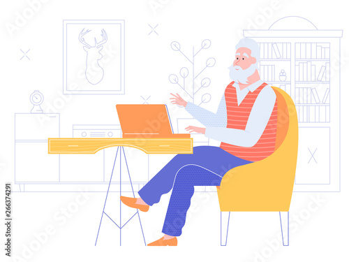 Senior žena surfování na internetu, chatování na sociálních sítích pomocí počítače, ploché vektorové ilustrace. Online komunikace. Starší lidé životní styl. Šťastný důchod. Starší online internetová aktivita.