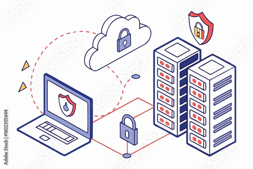 Serverové stojany, přenosný počítač a cloud se zámky, ploché vektorové izometrické ilustrace. VPN, virtuální privátní síť, Internet security.