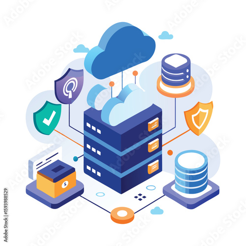 Serverové regály s cloudem, ploché vektorové izometrické ilustrace. Služba správy cloudového úložiště.