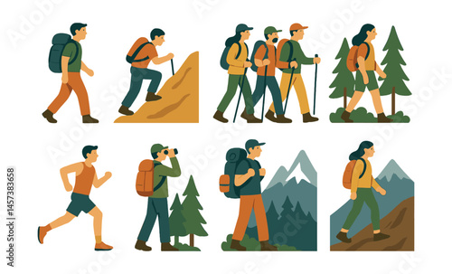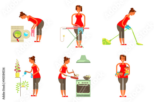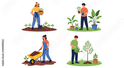 Sada zahradních aktivit s různým speciálním vybavením. Kopání, vychystávání, sklizeň, sečení, zalévání, ořezávání. Zahradnictví, zemědělství. Vektorové ilustrace v plochém designu