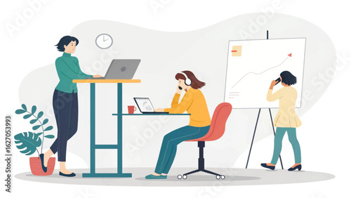 Švadlena módní návrhářka švadlena kreslené postavičky pracující v krejčovství obchodě pomocí šicí stroj měřicí páska dummy vector ploché izolované ilustrace. Šicí studio, oděvní továrna, ateliér