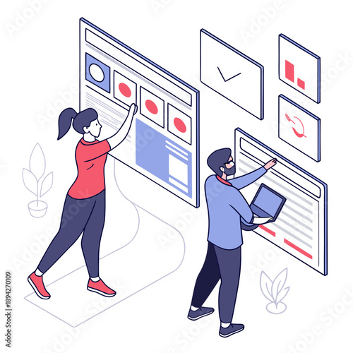 Švadlena švadlena žehlení červené šaty, vektorové ploché ilustrace izolované na bílém pozadí. Módní šicí studio, ateliér, zakázkové oblečení.