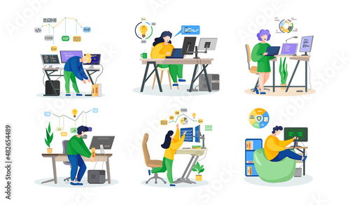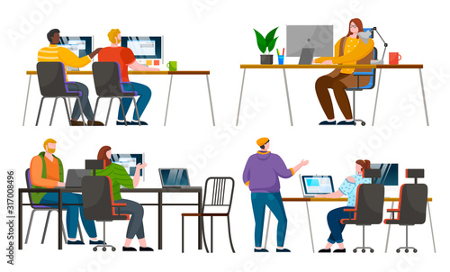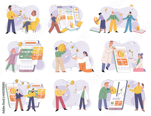 Šicí sada, vektorové izolované ilustrace. Švadlena, oděvní návrhářka, švadlena, kreslené postavičky zákazníků a krejčovské nástroje. Ateliér, Kurzy šití, Krejčovství nebo módní salon.