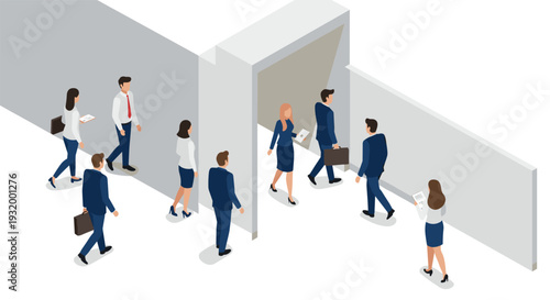 Podnikatelé, muž a žena lezení různé velikosti schodiště ke dveřím, ploché vektorové izometrické ilustrace. Sexismus, diskriminace na základě pohlaví, nespravedlnost, nerovnost a nespravedlivé Kariérní povýšení.