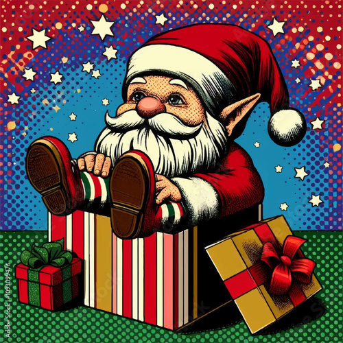 Sexy Santa pin up dívka v červených šatech drží dárek. Vektorová ilustrace v komiksovém pop artovém stylu. Vánoční svátky koncept plakát.