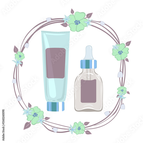 Šampon reklamy vektorové papír řez ilustrace. Produkt pro péči o vlasy olivový vlasový šampon plastová láhev balení mock up a krásné růžové dlouhé vlnité ženské vlasy.