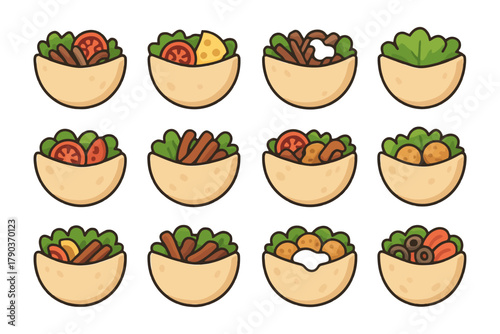 Shawarma promo banner šablona set, vektorové izolované ilustrace. Turecké rychlé občerstvení s sebou. Realistický pita chléb s kuřecím masem, hovězím masem, zeleninou. Doner kebab, burrito. Arabská kuchyně.