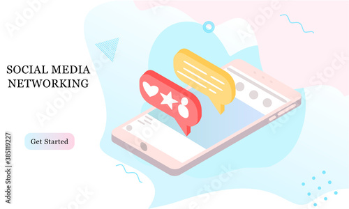 Aplikace pro nákupní banner, webová šablona. Vektorový izometrický smartphone s prodejem, slevou, dárkovými vývěsními štíty zdarma, lupou na obrazovce, kopírovacím prostorem, tlačítkem více informací.