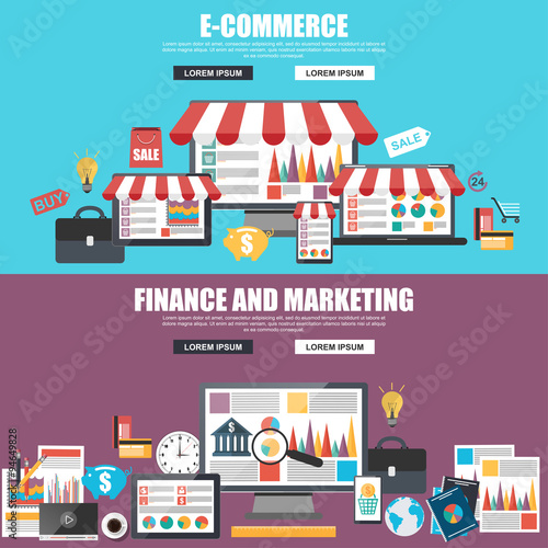 Nakupování v obchodě a místní trh koncept bannery. Barevné vektorové ilustrace. Obchod s potravinami, módní butik a pouliční bazar interiér.