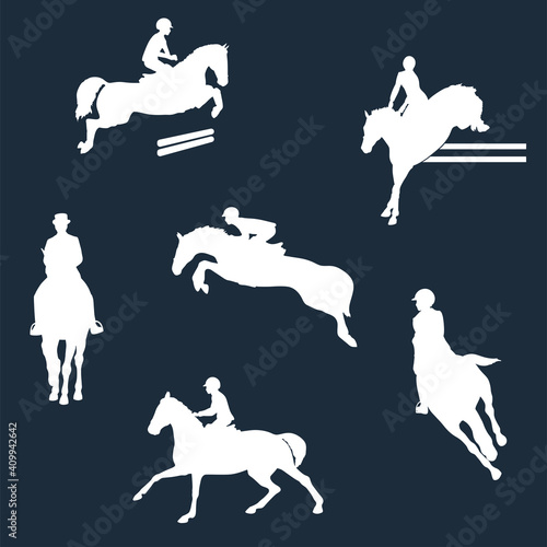 Soutěž v parkurovém skákání. Jezdec na koni, siluety skákajících koní, vektorové ilustrace ve stylu papírového umění. Překážkový závod. Jezdecká sportovní událost.