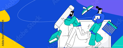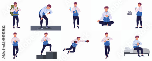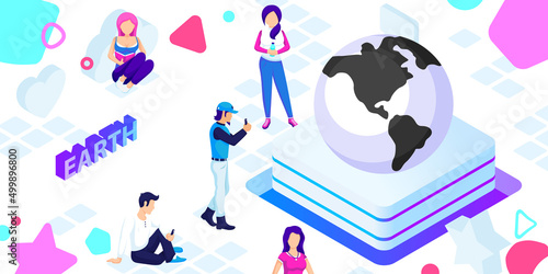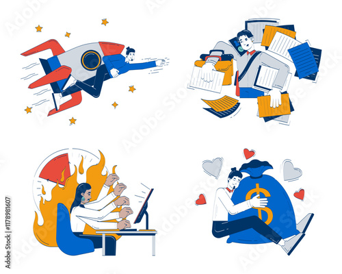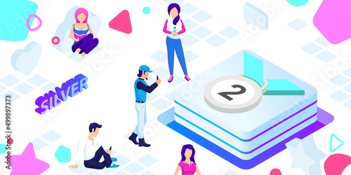 Skate park set, vektorové ploché ilustrace izolovaných na bílém pozadí. Izometrická skateboardová rampa a další vybavení skateparku, skateboardisté jezdící na skateboardech a předvádění triků.